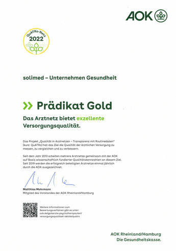 Wir freuen uns über eine besondere Anerkennung: Bei der jährlichen bundesweiten Auszeichnung von Arztnetzen durch die AOK wurde solimed für das Jahr 2022 eine exzellente Versorgungsqualität bescheinigt und dafür das Prädikat Gold verliehen.